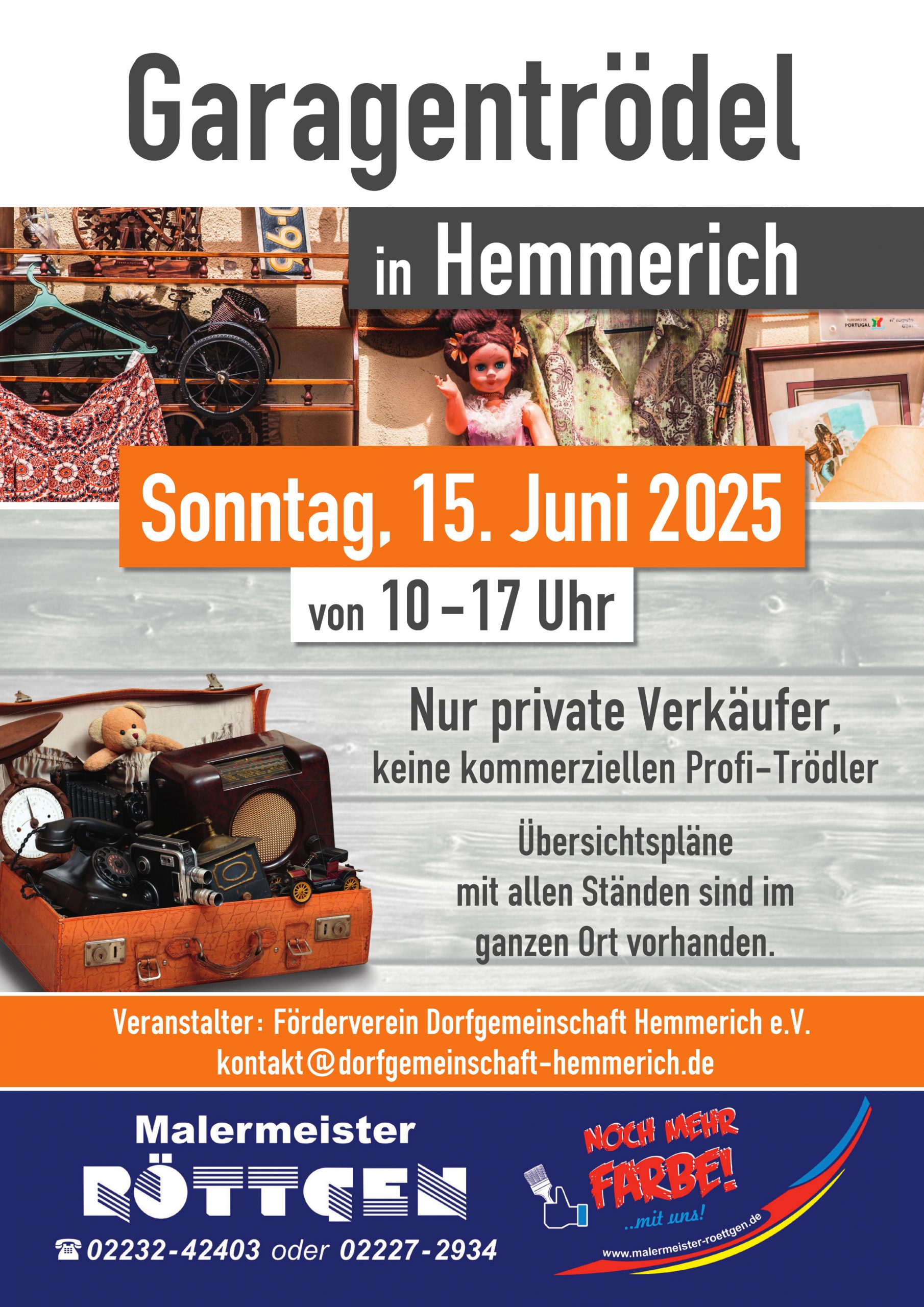 Wir, der Vorstand vom Förderverein Dorfgemeinschaft Hemmerich e.V. haben einen Termin für den Garagentrödel festgelegt. Im Einklang mit dem Veranstaltungskalender der Stadt Bornheim für 2025 und auf vielfachen Wunsch unserer Besucher, Aussteller und Mitbürger ist der Termin auf